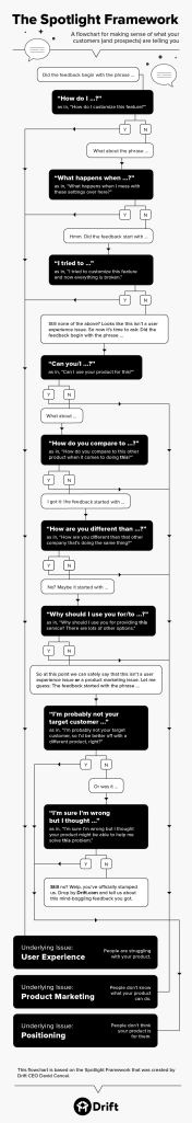 Drift’s ‘Spotlight Framework’ helps to address these two important questions with just three issue groups – user experience issues, product marketing issues and positioning issues.