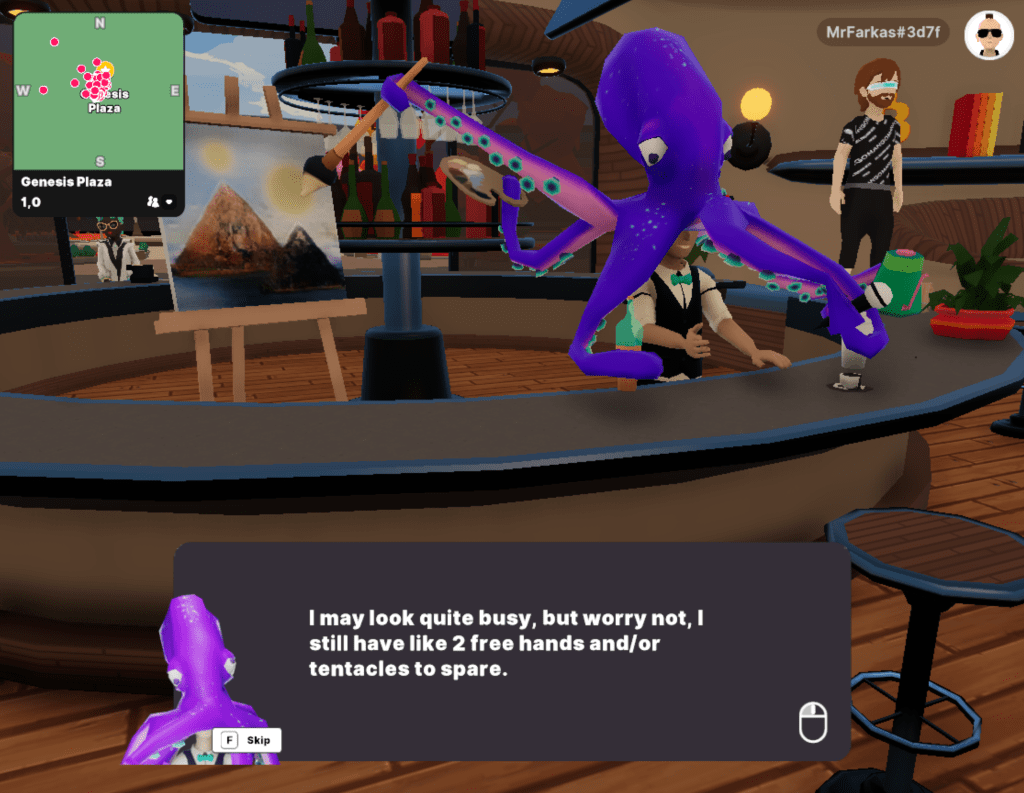 With this being my first trip to Decentraland there was a bit of a learning curve. Figuring out how to move my avatar around started out as the first challenge. As a non-gamer, trying to coordinate keyboard and mouse together was laughable at best but I eventually got a handle on the basic moves. Some of the tips here were helpful to start but once I figured out how to use the chat box the universal /help command also worked to bring up a list of handy shortcuts.