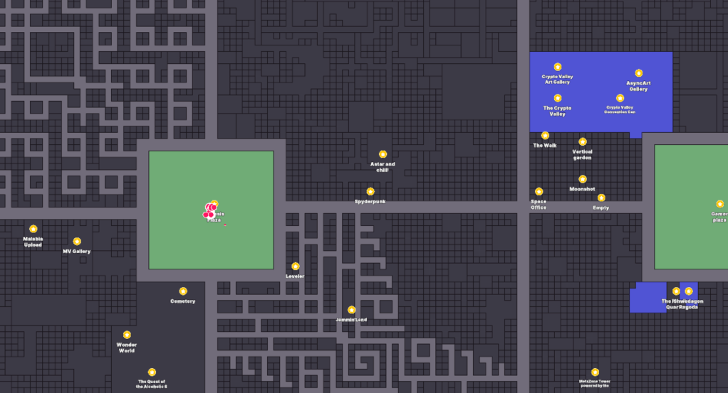 A screenshot of a map of Decentraland. Land in Decentraland is called LAND and refers to the small grey squares, each 16X16 feet, that are bought and sold as NFTs.