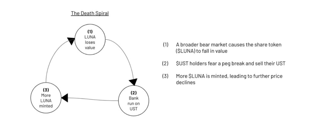 Within days, the big panic is at full speed and the dreaded βdeath spiralβ begins. Arbitrageurs redeemed UST for Luna which they then sold, leading to a significant decrease in its price, which necessitated more Luna being minted for each UST burned, creating a hyper-inflationary loop in Luna’s supply.