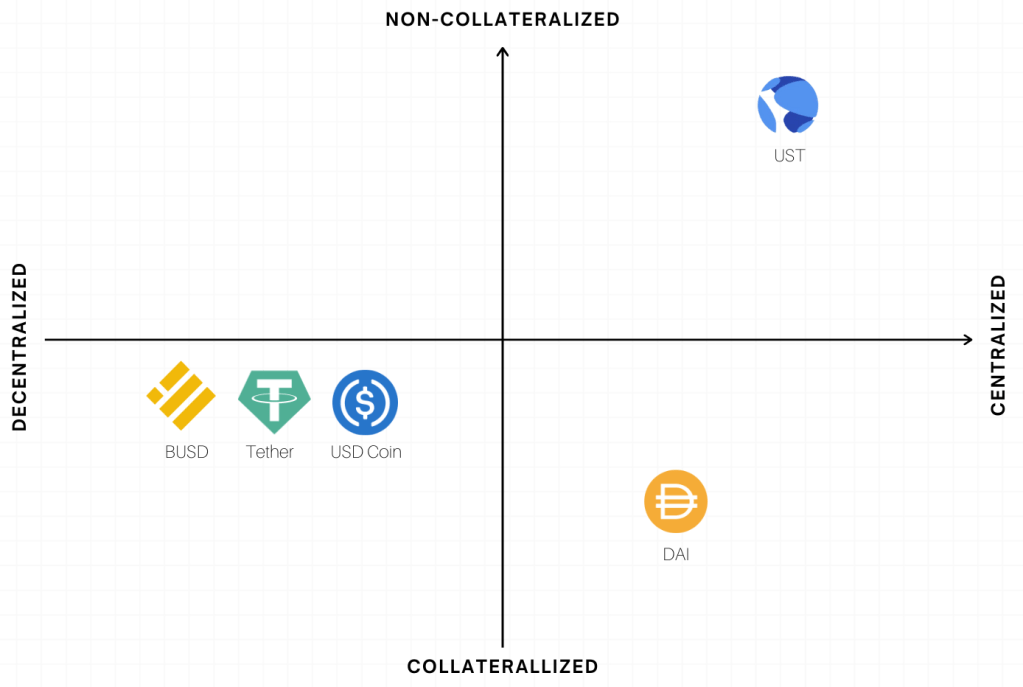 | Algorithmic | Not backed by any assets. An algorithm manages the price and maintains the value | – No collateral needed – Controlled by a public algorithm | – Faith in the algorithm – Balance of coins changes based on total supply | UST USDD |