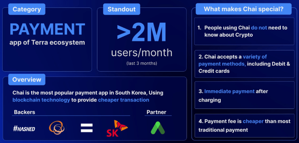 Playing a critical role in accelerating the adoption of Terra stablecoins in real life, payment processing with CHAI was so easy that its users had no idea it had anything to do with blockchain.