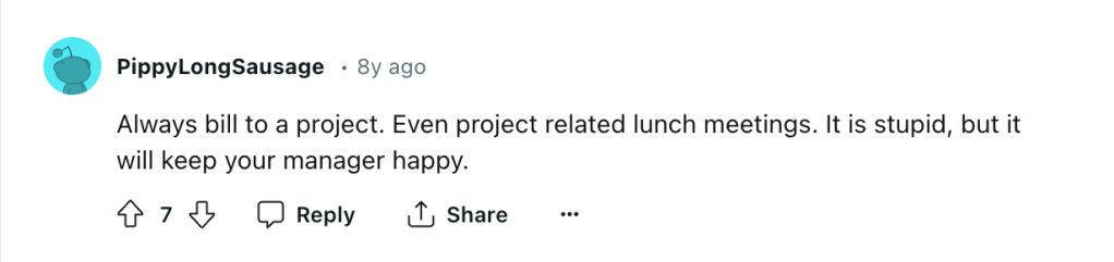 David C. Baker explains it the best, if an activity would cease without the client, it’s billable. Deciding what counts shouldn’t fall on employees. Clear guidelines from the start ensure everyone’s on the same page. The easiest solve is to have only billable jobs for client work.