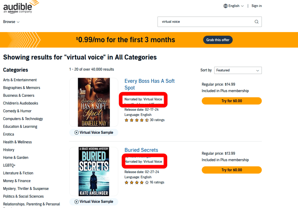 Audible AI Narrated Audiobooks: Creates audio versions of books.