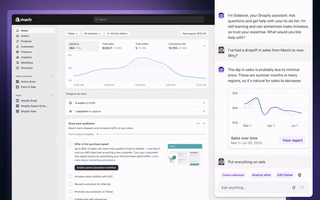 Shopify Sidekick: Navigates the Shopify platform, automates routine activities, and makes recommendations.